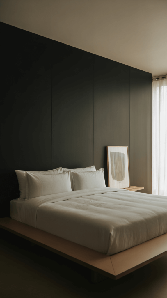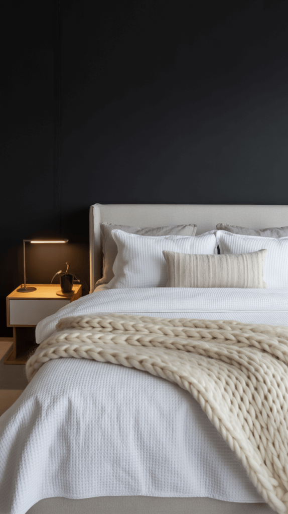 5. Black Accent Wall with White Bedding: The Ultimate High-Contrast Play