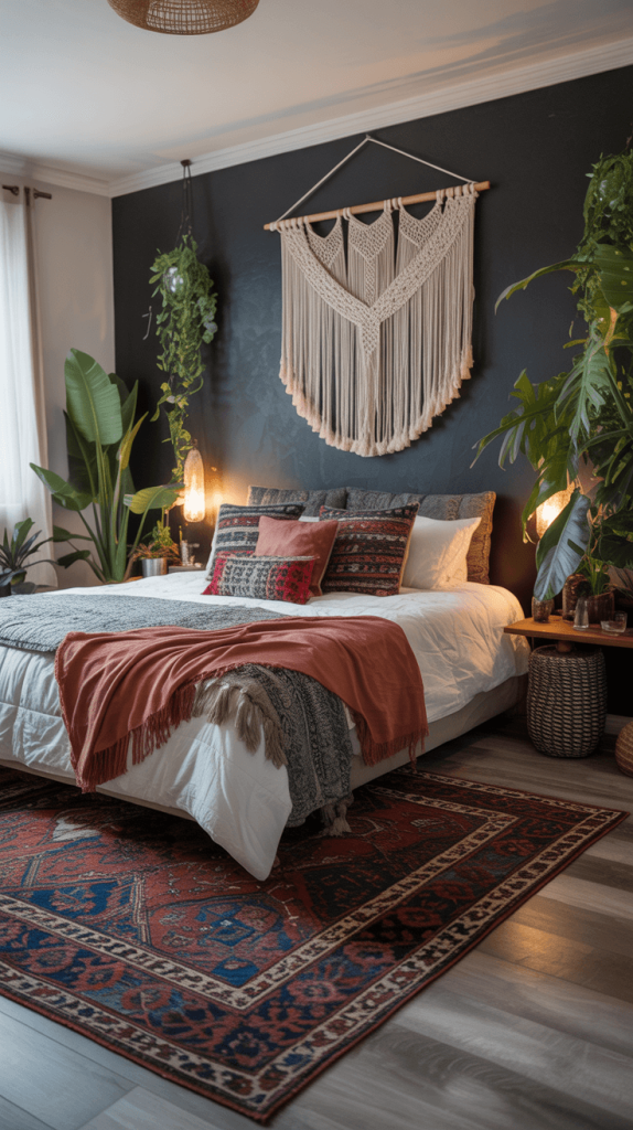 11. Boho Chic Black Accent Wall Bedroom: The Free-Spirited Contrast