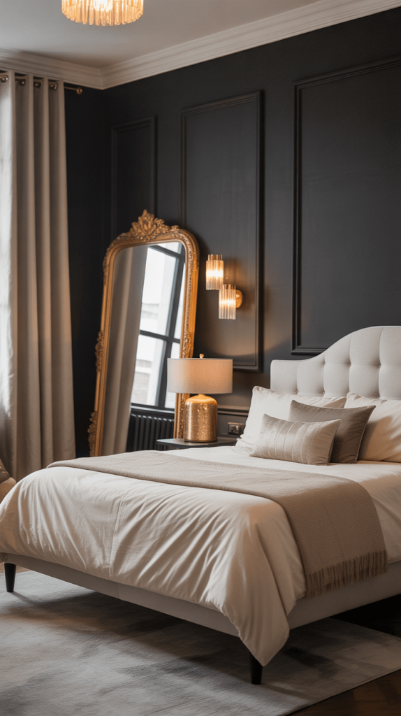 - How to Nail It: Paint your wall a deep, moody black. Then, introduce gold through your fixtures and accessories. A statement gold-framed mirror leaning against the wall? Perfection. Gold bedside sconces or table lamps? Yes, please. Even smaller touches like gold drawer pulls, a jewelry dish, or picture frames can tie the whole look together.