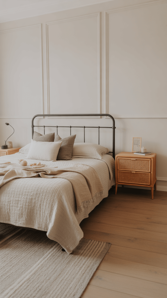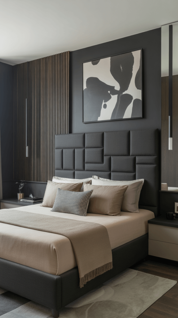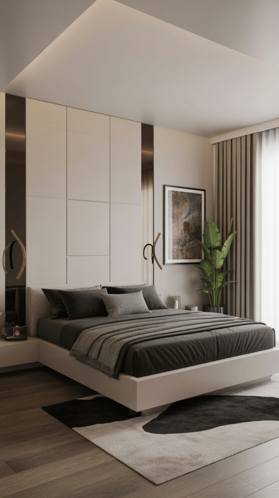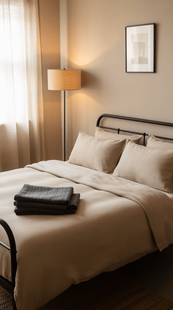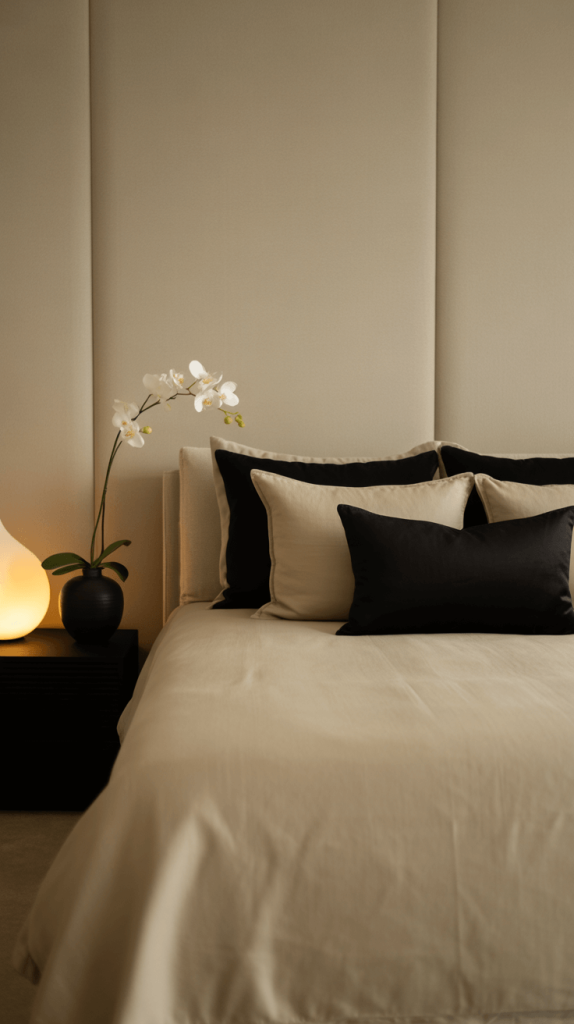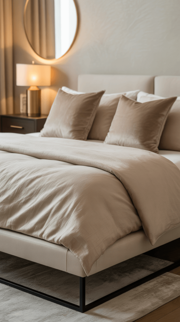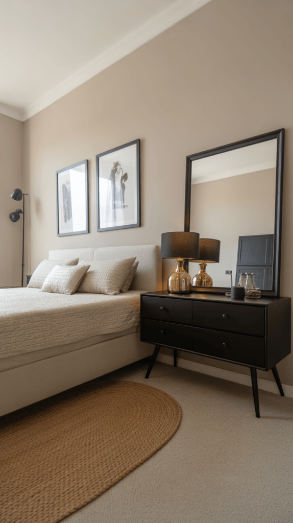 - Mix Your Materials: Modern design loves a good material mix. Try pairing the softness of your beige textiles with the cool sheen of black metal (on bed frames or lighting), the smoothness of glass (on a nightstand), or the richness of black-stained wood.