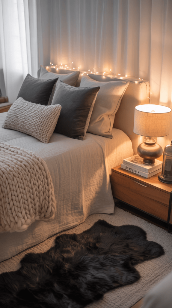 - Layer Those Textures: This is your number one tool. A chunky, beige knit throw blanket? Essential. A soft, black faux fur rug beside the bed? Absolutely. Linen bedding in a light beige, velvet pillows in charcoal… see where I’m going? The mix of textures adds depth and a ton of tactile comfort.