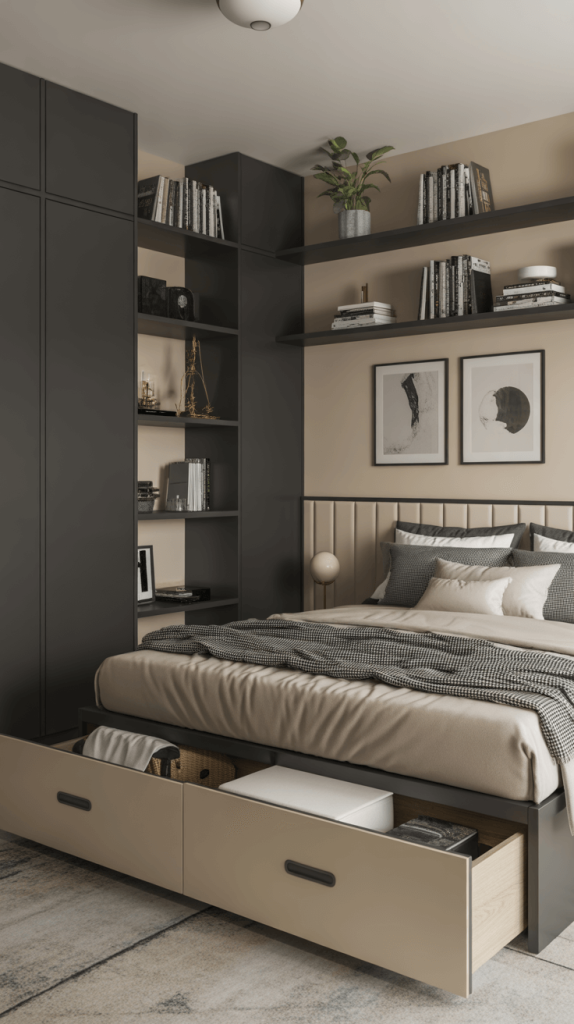 15. Black and Beige Bedroom Storage and Organization Ideas