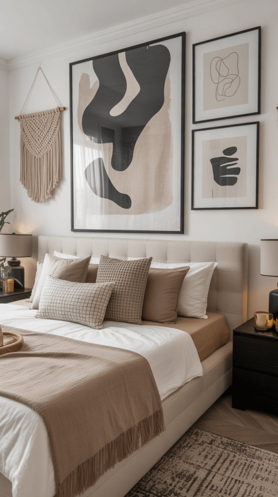 - One Large Statement Piece: Go big or go home, right? One massive piece of art above the headboard can define the entire room. Look for abstract prints with beige and black strokes, or a dramatic black-and-white photograph.