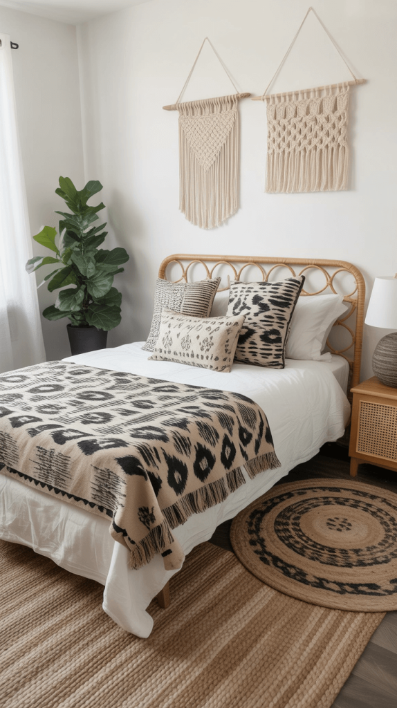- Natural and Handmade Elements: Incorporate rattan, macramé, jute, and woven baskets. A rattan headboard, a jute rug, macramé wall hangings—these natural textures in beige tones are the heart of boho style, with your black elements providing structure.