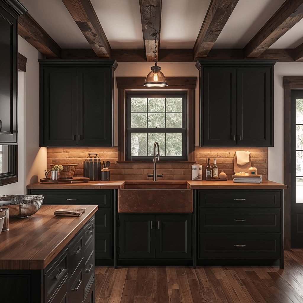 Think black and copper can’t do cozy? Think again! Rustic kitchens benefit hugely from this color duo. Distressed black cabinets paired with hammered copper sinks and vintage-style fixtures create that perfect farmhouse-meets-sophistication vibe.