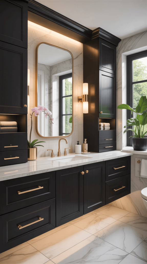 Lighting is the jewelry of a room, and in a black and gold bathroom, it’s non-negotiable. This idea pairs two key elements: a sleek black vanity and statement gold lighting.