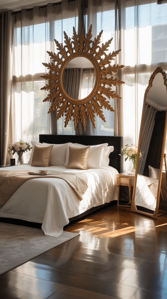 - Functional Glam: Don’t forget practical mirrors. Gold-framed mirrors on your closet doors or a beautiful mirror on your dresser tie the function into your theme.