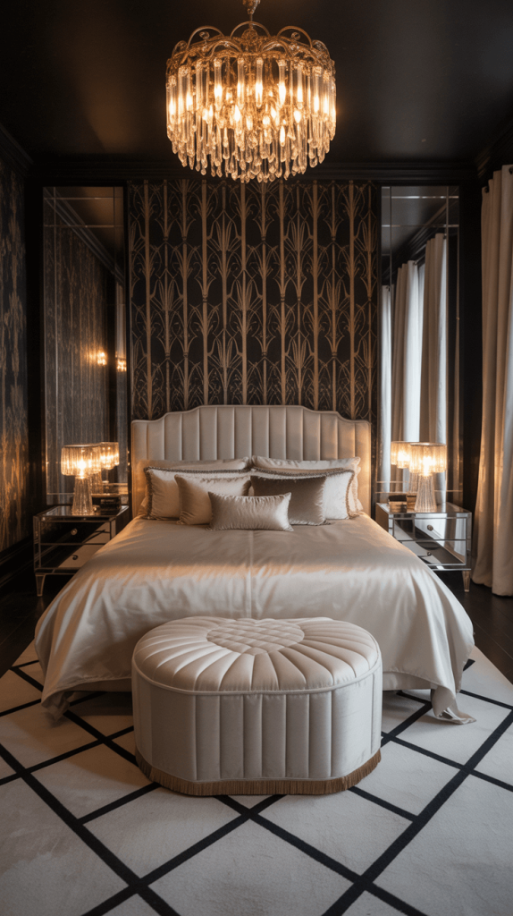 - Glamorous Patterns: Don’t be afraid of pattern! Think black and white geometric prints (like chevrons or Art Deco fan patterns) on a rug or accent pillows. You can even find gorgeous gold-printed wallpaper for a feature wall.