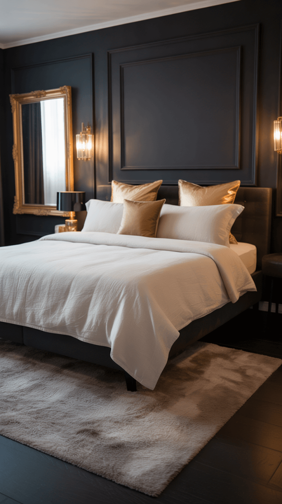 - Balance is Key: If you have a black wall, you must balance it with light elsewhere. White or light-colored bedding is a must. A large, light-colored rug is also crucial. This contrast prevents the room from feeling like a cave.