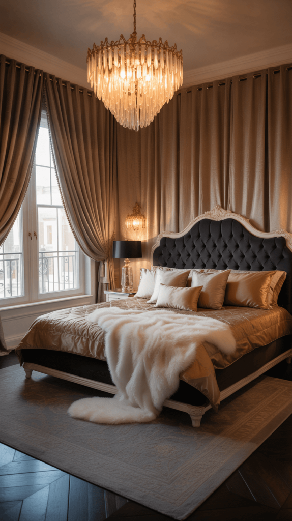 - Layer Those Textures: This is where you go all out. Velvet, silk, faux fur, and satin are your new best friends. A deep black velvet headboard is an absolute game-changer. IMO, it’s the fastest way to add instant luxury. Drape a faux fur throw across the bottom of the bed and pile on silk and satin pillows in gold, black, and cream.
