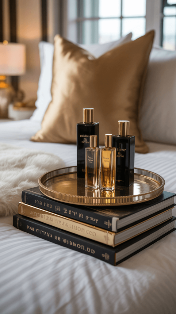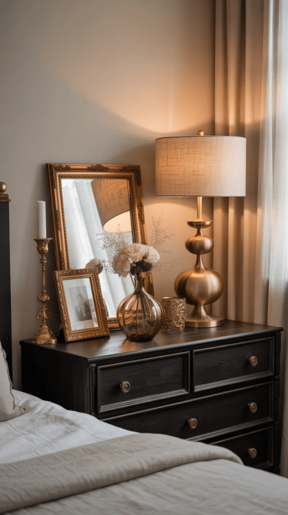 - Decorative Objects: Curate a small collection of objects on your dresser or shelves. A gold tray holding black perfume bottles, a stack ofcoffee table books with black and gold covers, a small sculpture.
