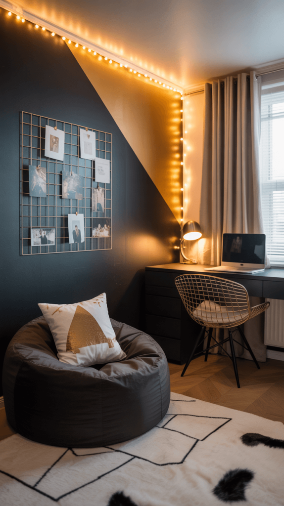 - Make it Fun: Incorporate their interests! Gold wire wall grid for photos and tickets, black and gold posters of their favorite bands in gold frames, a cool black bean bag chair.