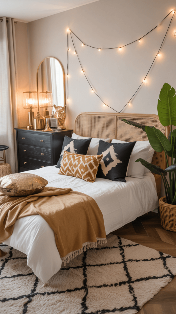 Boho style is all about mixing patterns, textures, and global influences in a relaxed, personal way. It’s effortless and cozy. Combining it with black and gold creates a surprisingly warm and inviting space.