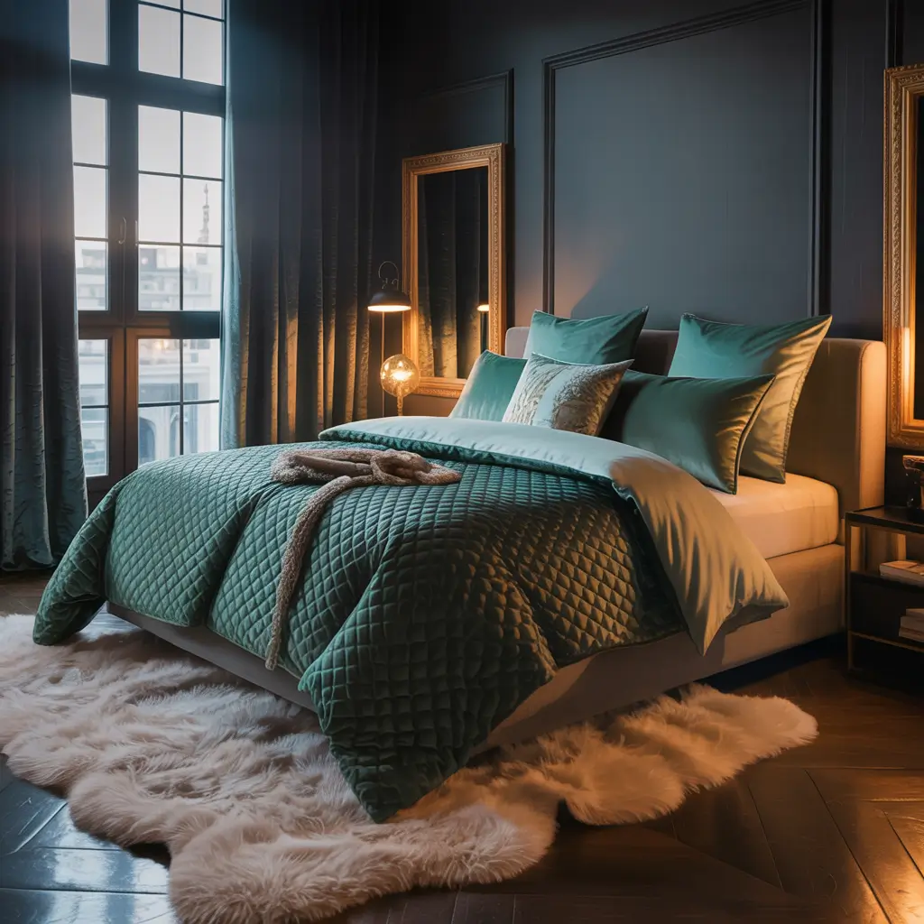Start with your base: charcoal or deep black walls create that cocoon-like feeling we’re after. Then bring in emerald green through your textiles. Think velvet curtains that catch the light just right, or a plush emerald throw draped casually across your bed. The key here? Balance is everything. Too much black and you’re living in a cave; too much emerald and you might feel like you’re sleeping in a jewelry box.