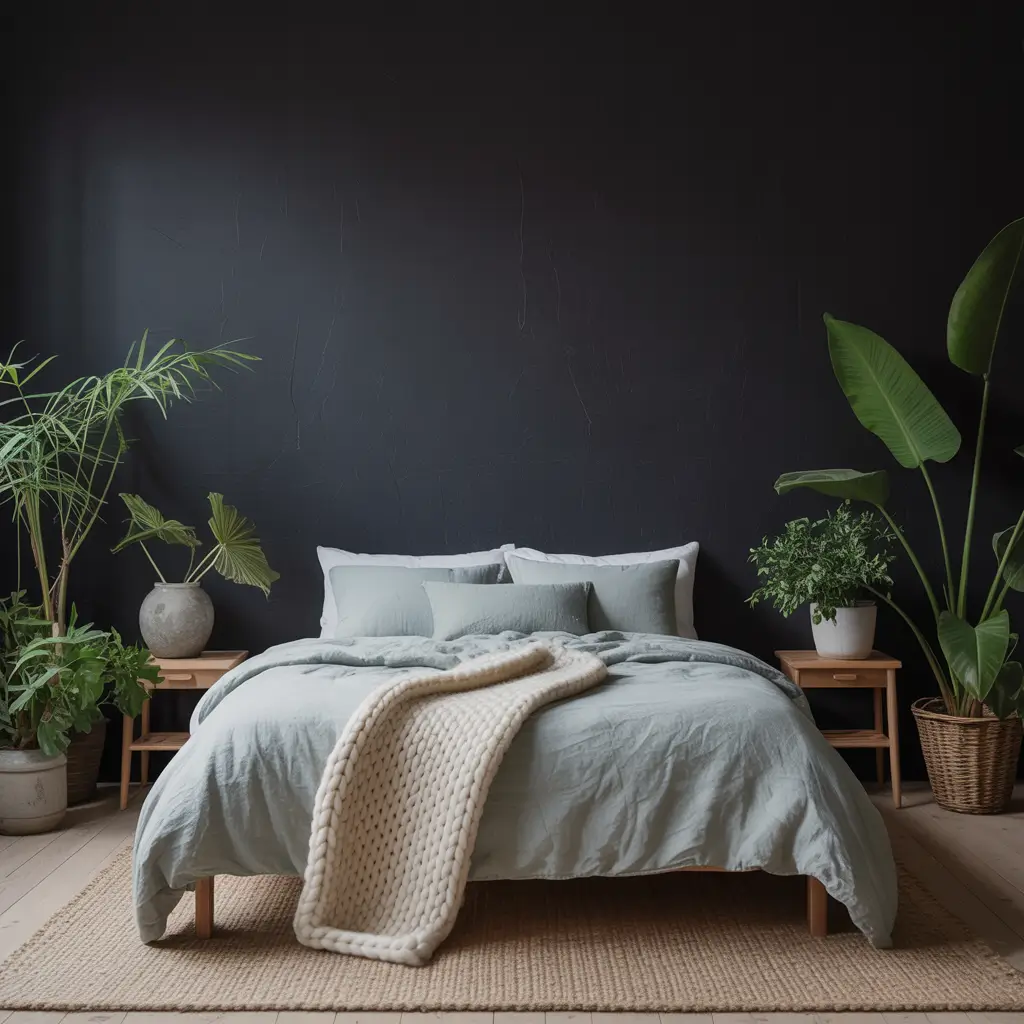 Layer different shades of green to mimic nature’s variety: sage, olive, emerald, and forest green all playing together. Use black as your grounding element through furniture and frames. Natural materials are essential here—rattan baskets, wooden furniture with black metal accents, and linen bedding in earthy greens.