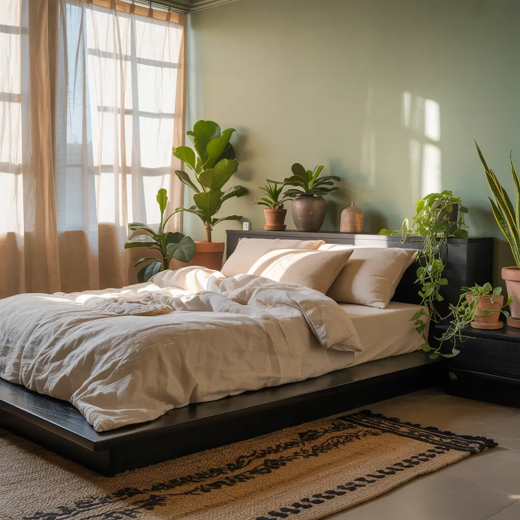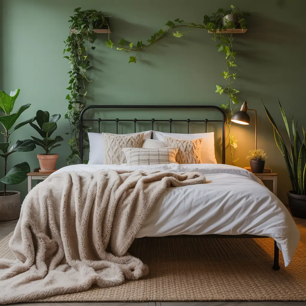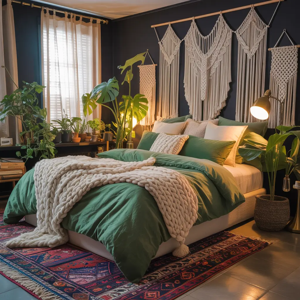 Start with a black metal bed frame (wrought iron works beautifully here) and layer it with green textiles in various patterns—paisley, mandala prints, or tribal designs. Macrame wall hangings in black cord against sage green walls? Absolutely yes. Mix in plenty of plants in hanging planters, woven baskets, and mismatched containers.
