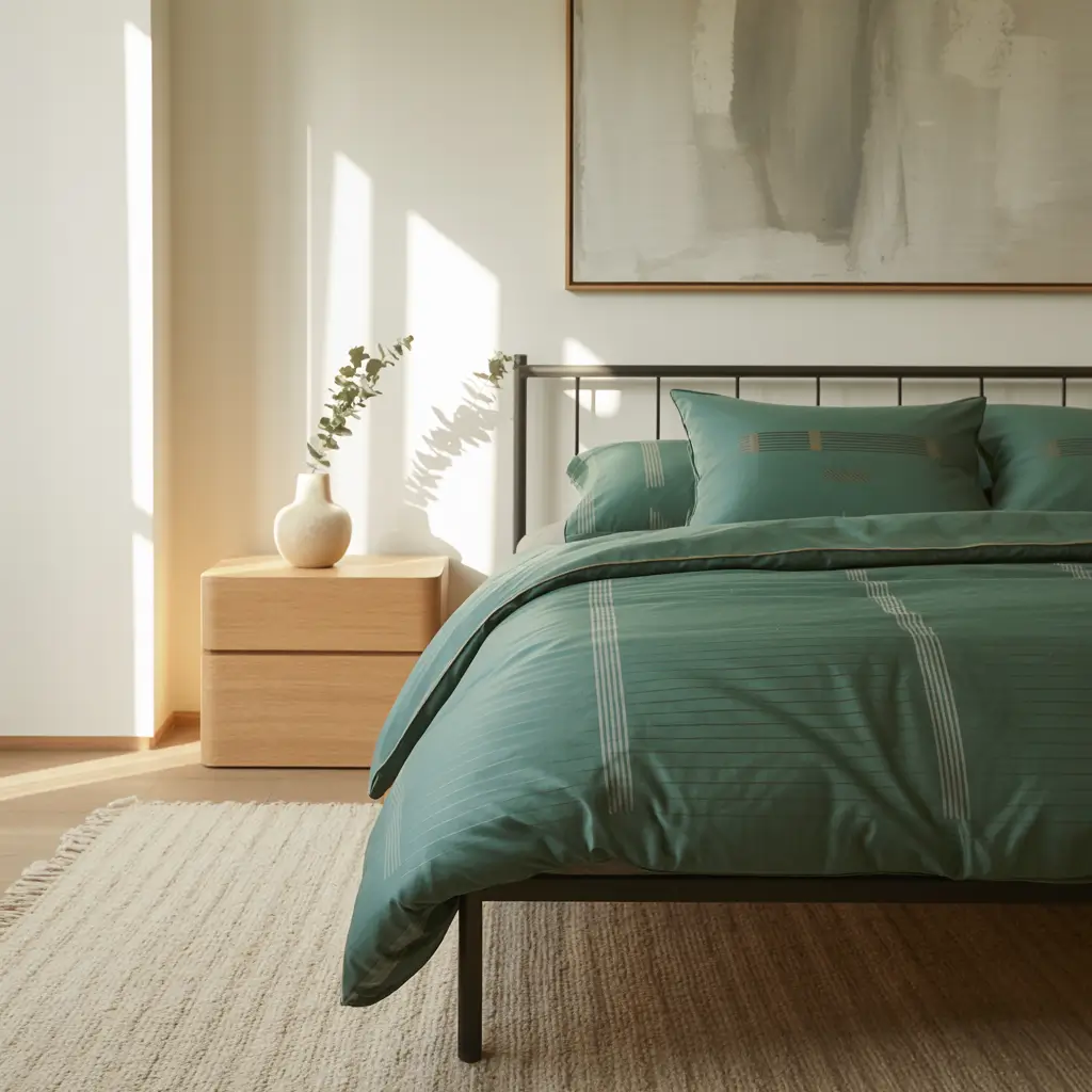 Start with a base of crisp black sheets—they hide everything and look sharp as hell. Layer a geometric green and black duvet cover on top, or go for color-blocking with one side black and one side sage green. The modern aesthetic loves clean lines and purposeful choices.