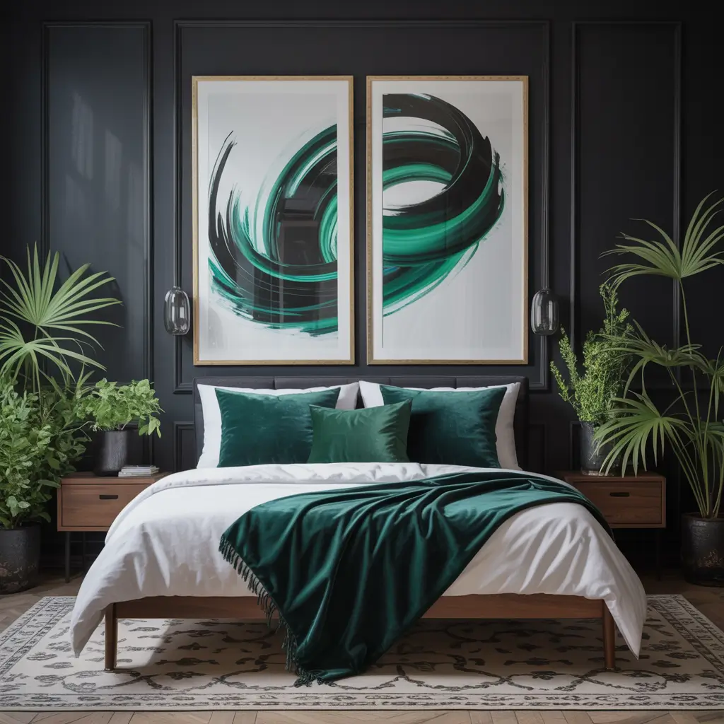 Create a gallery wall mixing black frames with botanical prints featuring various shades of green. Abstract pieces that incorporate both colors add sophistication without being too literal. I personally love oversized single pieces—a massive black and green abstract painting above the bed makes a statement without trying too hard.