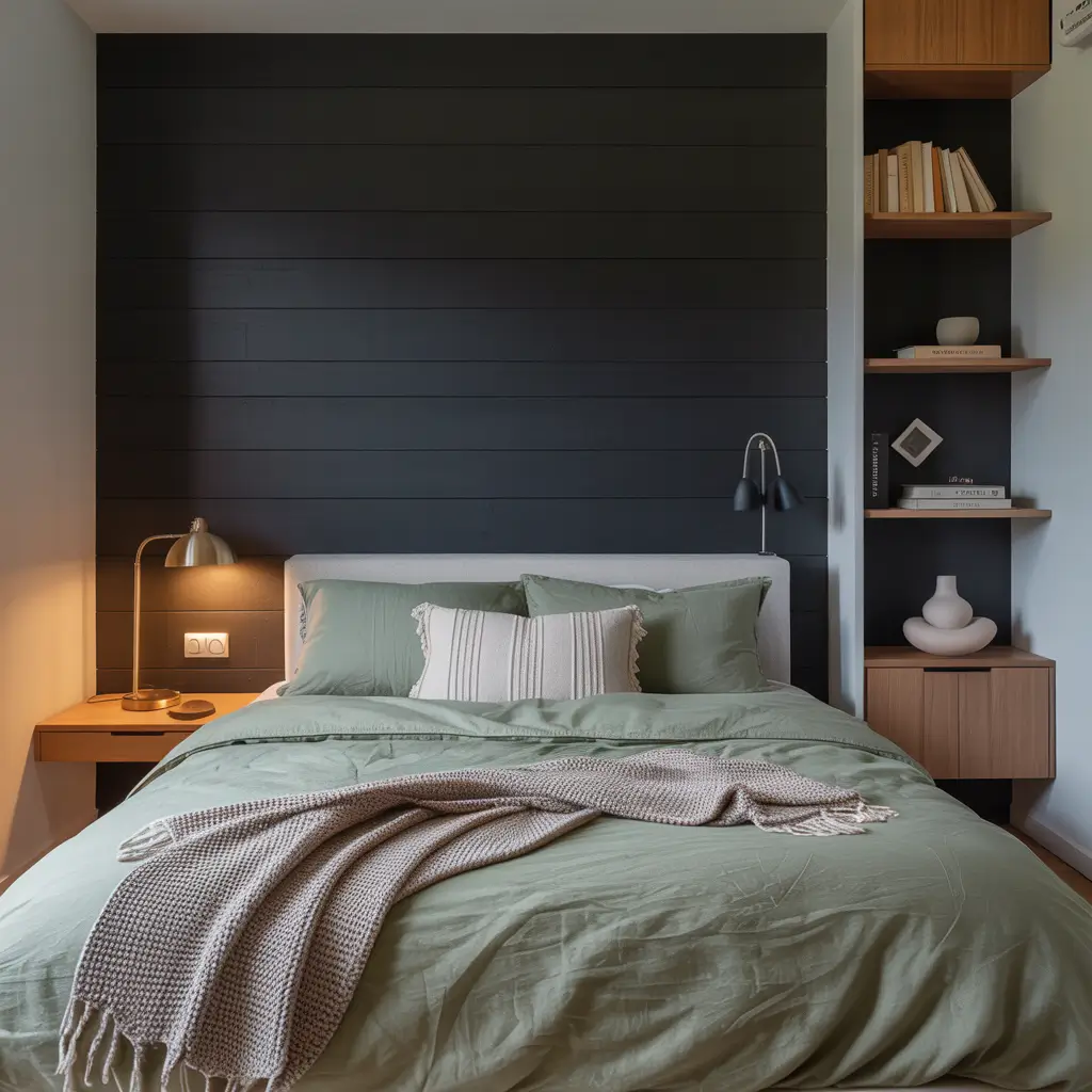 Pick one wall—preferably the one behind your bed—and go bold. A geometric pattern using black and sage green creates visual interest without overwhelming the space. You could paint triangular shapes, create a color-blocked design, or even use removable wallpaper if commitment issues are your thing (no judgment here).