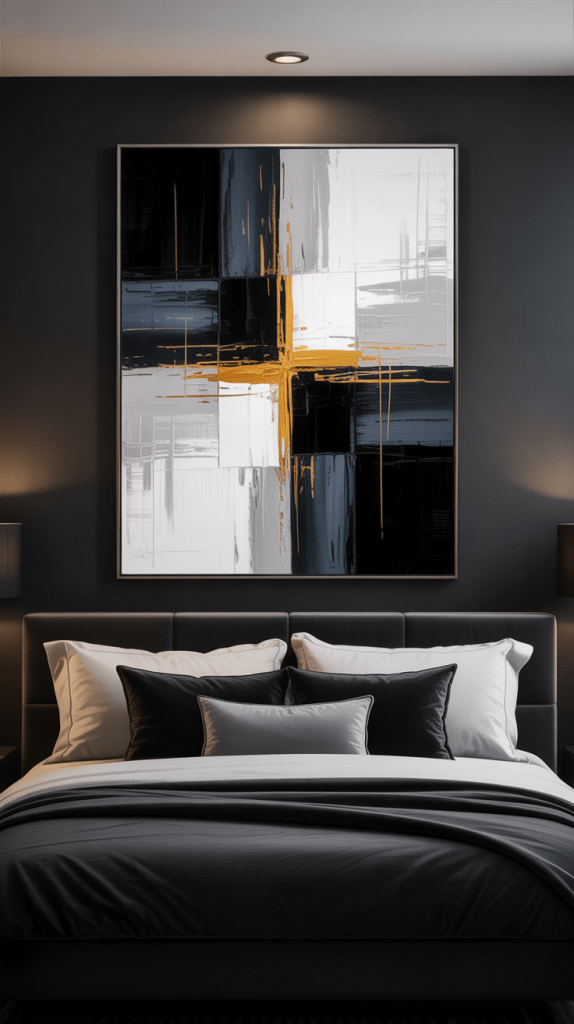 Blank black walls can feel a bit… intense. The solution? Art. But not a bunch of tiny, scattered pieces. Go big or go home.