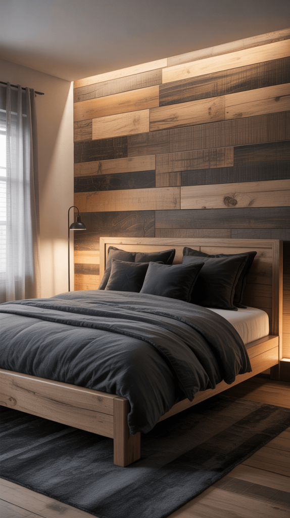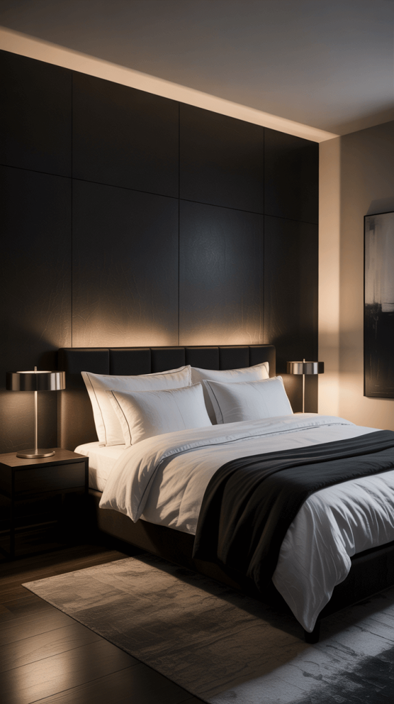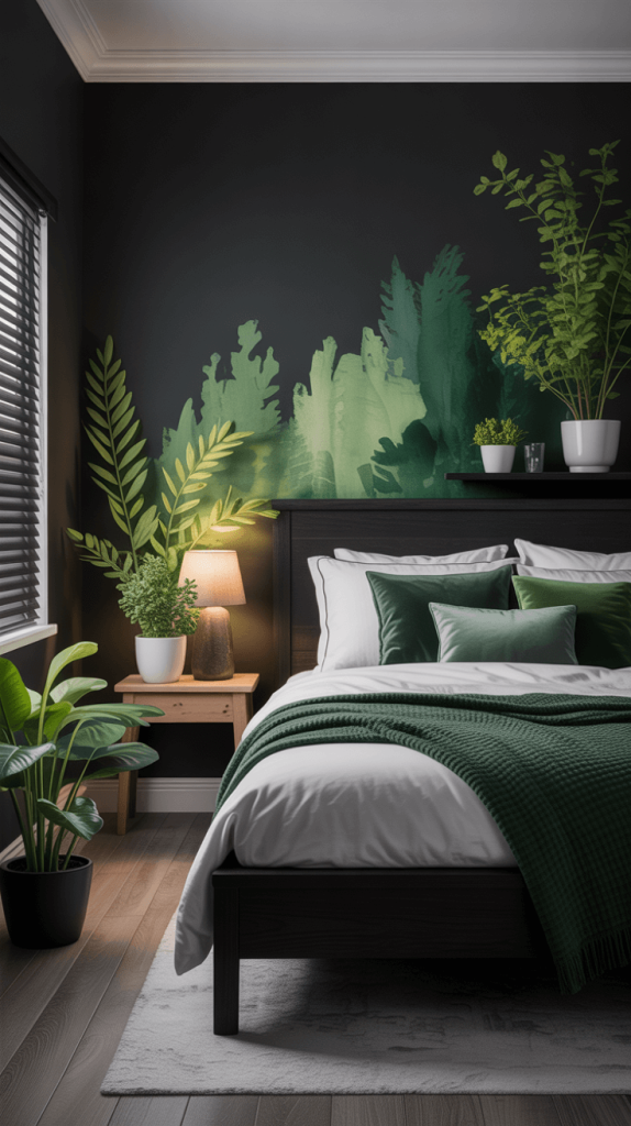 I once paired a very dark, almost black feature wall with a pale ash wood bedframe, and the contrast was chef’s kiss. The wood kept the black from feeling too heavy and added a touch of nature that made the room feel balanced.