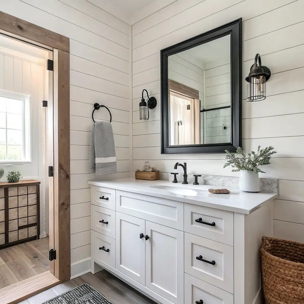 White shiplap brings texture and visual interest without overwhelming the space. The horizontal lines actually make your bathroom feel wider – it’s an optical illusion that actually works. Add black hardware into the mix, and suddenly you’ve got this sophisticated contrast that elevates the whole look.