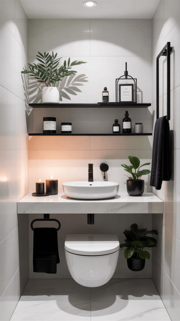 Or a crisp white shelf to blend into the wall. You can style them with folded black and white towels, a small plant, and your prettiest products (looking at you, Aesop).