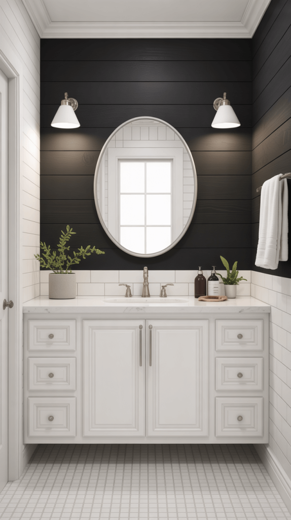 Using black shiplap on one wall—perhaps behind the vanity or in the shower—adds an incredible amount of texture and cozy, almost rustic charm.