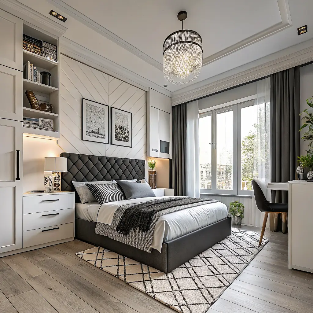 Consider furniture with hidden functionality. Storage beds, nightstands with charging stations, and mirrors with hidden jewelry storage keep your space sleek and organized. Match your hardware across all pieces – all black or all chrome, never mix metals in monochrome spaces.