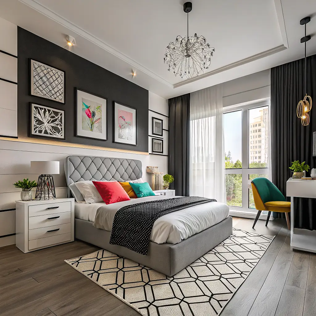 Keep walls predominantly white to maximize light reflection. Use black as an accent through bedding, artwork, and small furniture pieces. Vertical stripes on one accent wall create the illusion of height – learned this trick from a designer friend, and it’s genius.
