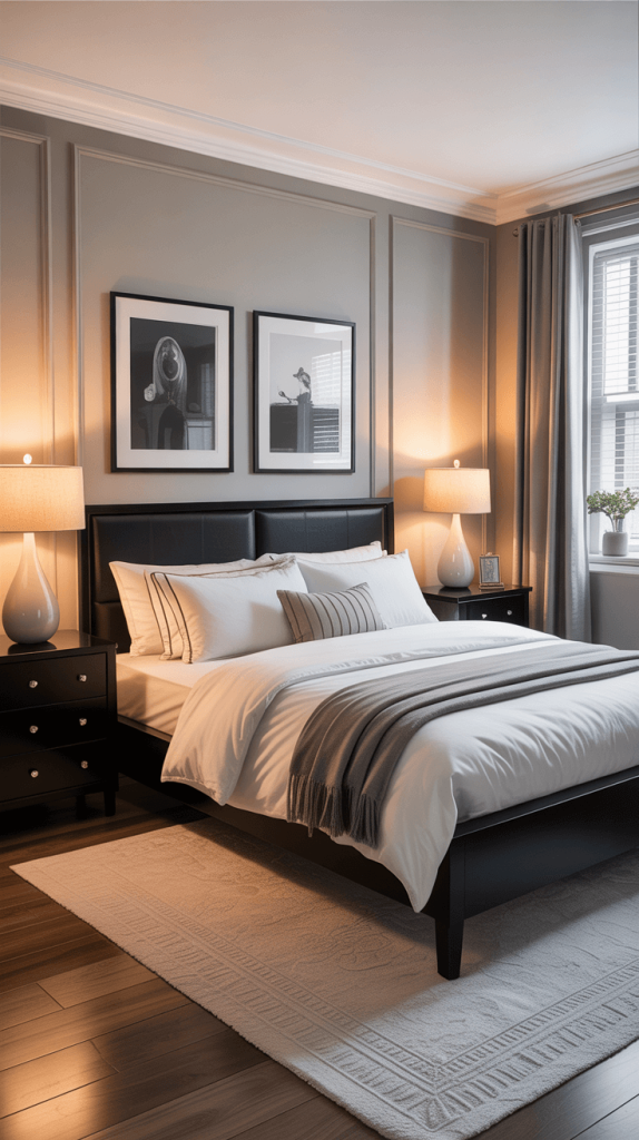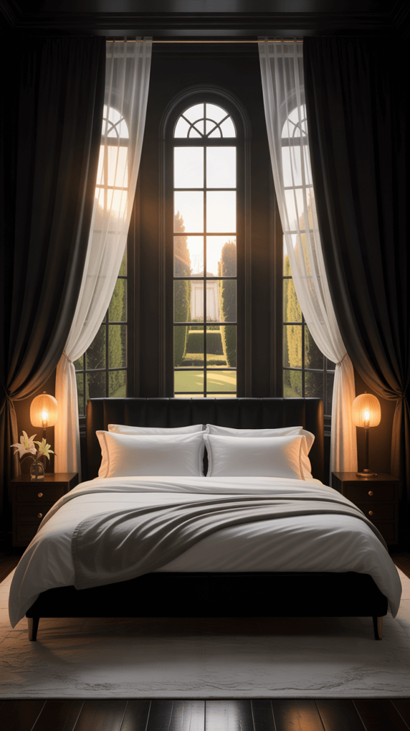 If you’re not ready to commit to paint or wallpaper, let your furniture do the talking. A statement black bed frame, a sleek black dresser, or a pair of black nightstands can ground the entire room.