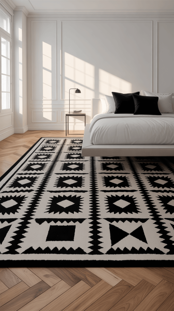 A black and white rug can either be a subtle base layer or the main event. A simple black border on a white rug defines the space quietly.