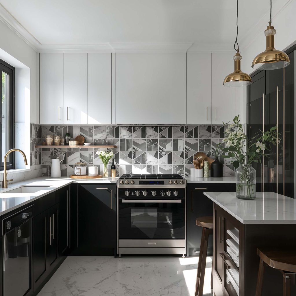 Want to inject personality without going crazy? An artistic black and white backsplash becomes your kitchen’s signature piece. Think geometric patterns, abstract designs, or even photographic tiles. My cousin installed a black and white cityscape backsplash, and it’s literally all anyone talks about when they visit.