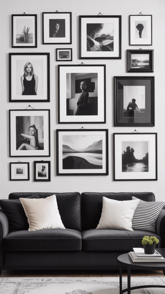- Incorporate other objects: Don’t just use prints. A small black mirror, a white ceramic wall sculpture, or even a cool black wall sconce can be part of the gallery.