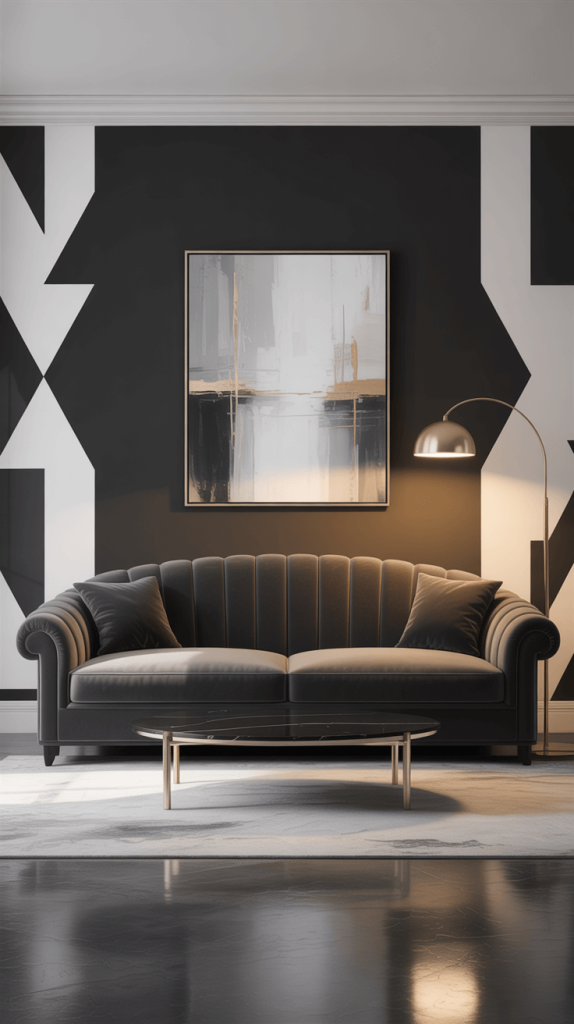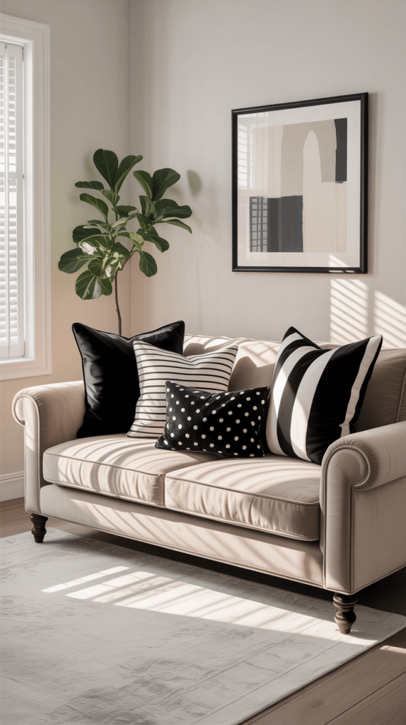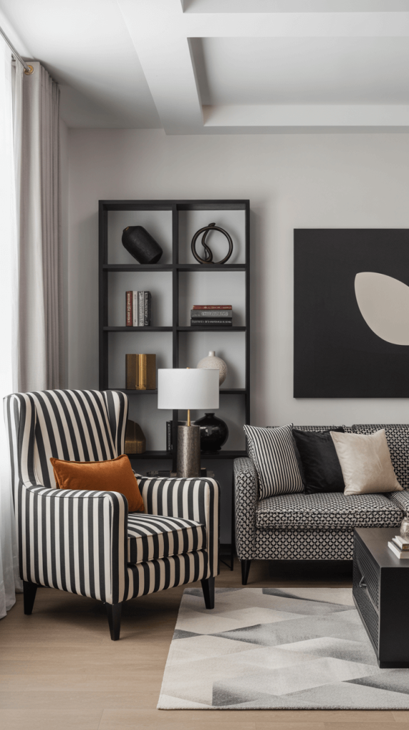 We’ve talked about solid furniture, but what about patterned pieces? Incorporating a single piece of furniture with a black and white pattern is a fantastic way to add visual energy.