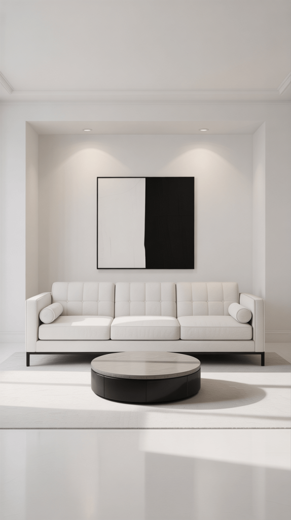This idea is for those who truly adore a clean, edited, and serene aesthetic. Choosing large furniture pieces in stark black or crisp white is a powerful move.