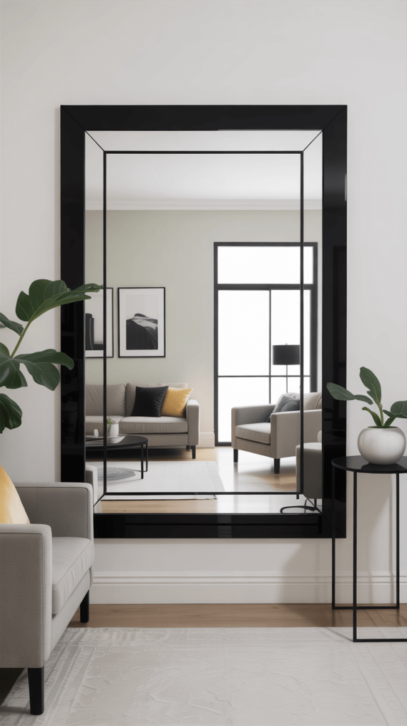 - A minimalist mirror with a geometric frame painted in a high-gloss black and white.