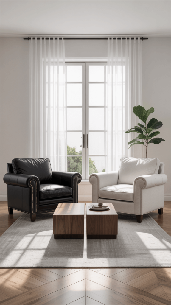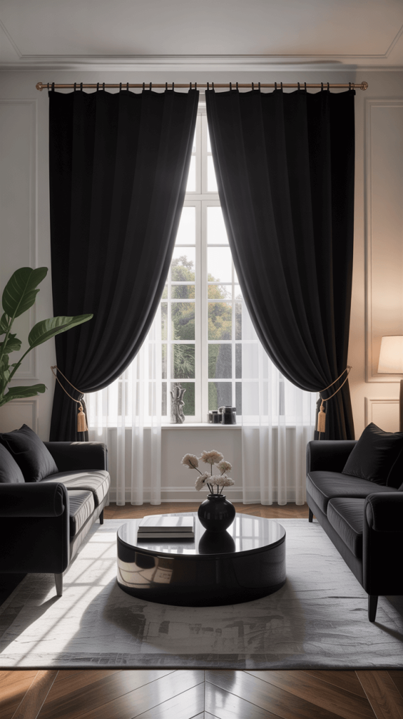- For a soft, elegant look: Crisp white linen or cotton curtains will filter light beautifully and maintain an airy, bright feel. You can then use a black curtain rod to subtly reinforce the theme.