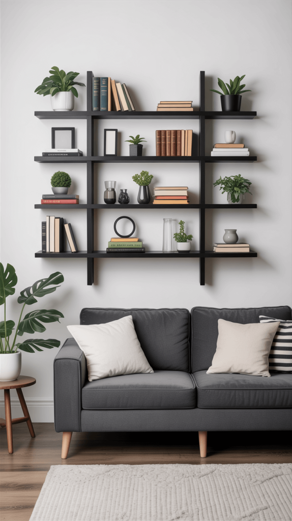 - White shelves on a black wall have a more subtle, integrated feel. They keep the focus on your decor items rather than the shelf itself.