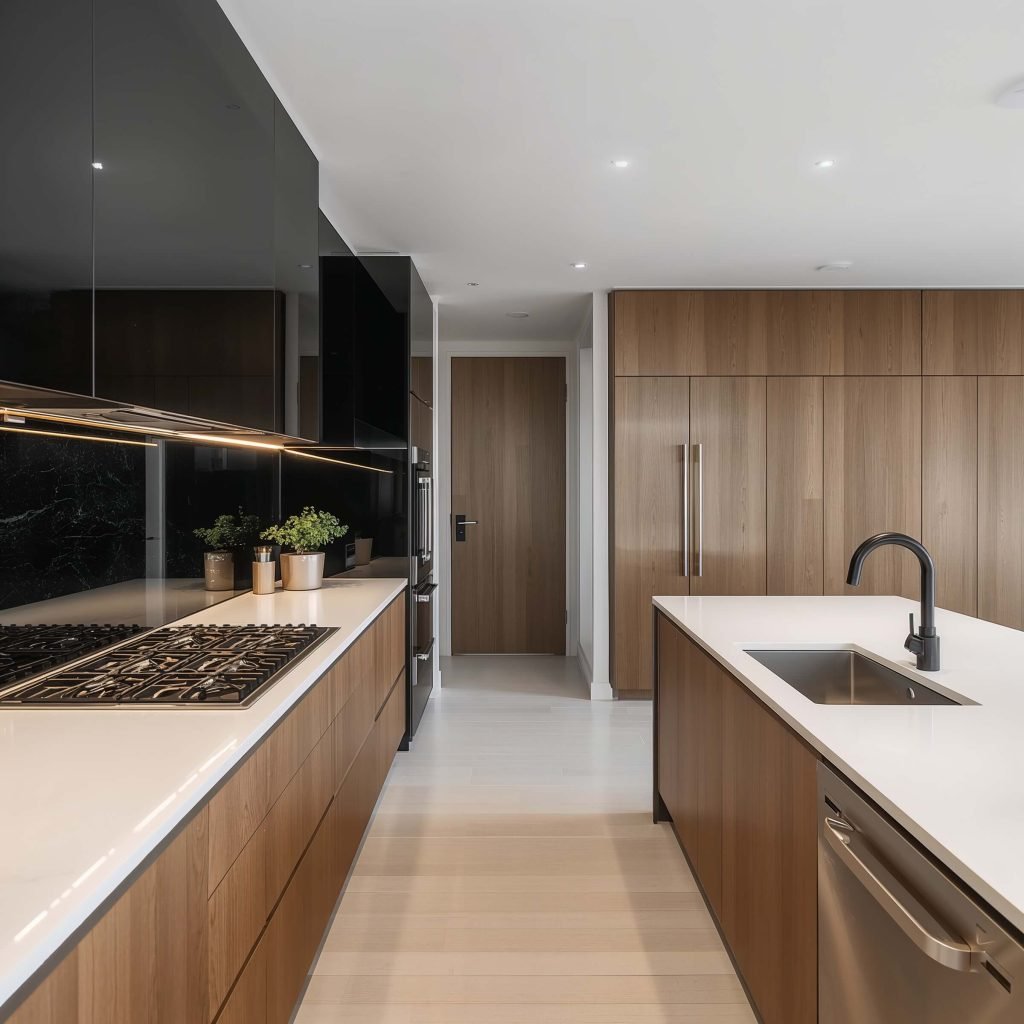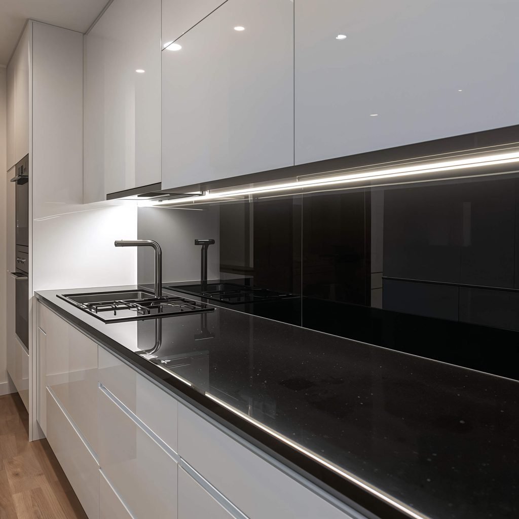 I always recommend going with a high-gloss finish for modern designs. Why? Because it reflects light beautifully and prevents your kitchen from feeling too dark. Plus, fingerprints and water spots are way less visible on glossy surfaces – trust me on this one.