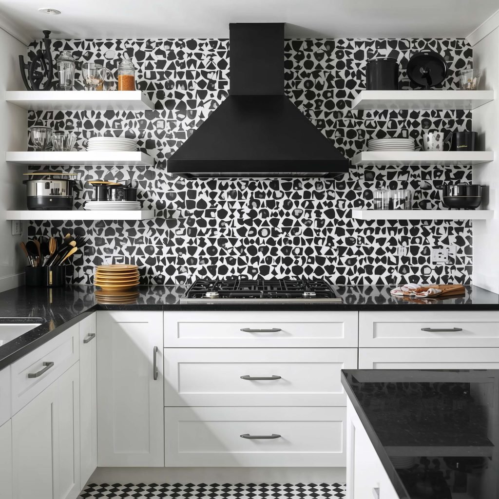 You could go with a checkerboard pattern if you’re feeling retro (and brave). Or maybe alternate black and white tiles in a more subtle pattern. My personal favorite? Black backsplash with white shelving or a white range hood cutting through it. The visual break keeps things interesting without being too busy.