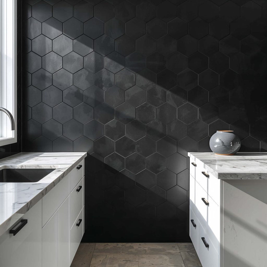I recently used large-format black hex tiles in a kitchen remodel, and the geometric pattern added so much visual interest without being overwhelming. The shape itself creates natural movement and flow, which keeps the black from feeling too heavy or static.