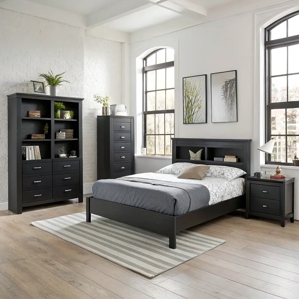 Let’s kick things off with the modern approach because, honestly, this style never gets old. Modern black furniture focuses on clean lines, geometric shapes, and minimal ornamentation. Think platform beds with integrated nightstands and dressers that look like they belong in an art gallery.