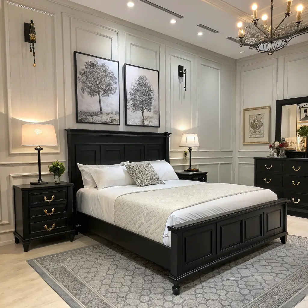 Large bedrooms can feel cold if not properly furnished. Black furniture helps create intimate zones within the larger space. Don’t spread pieces too thin—cluster them thoughtfully to create cozy vignettes.