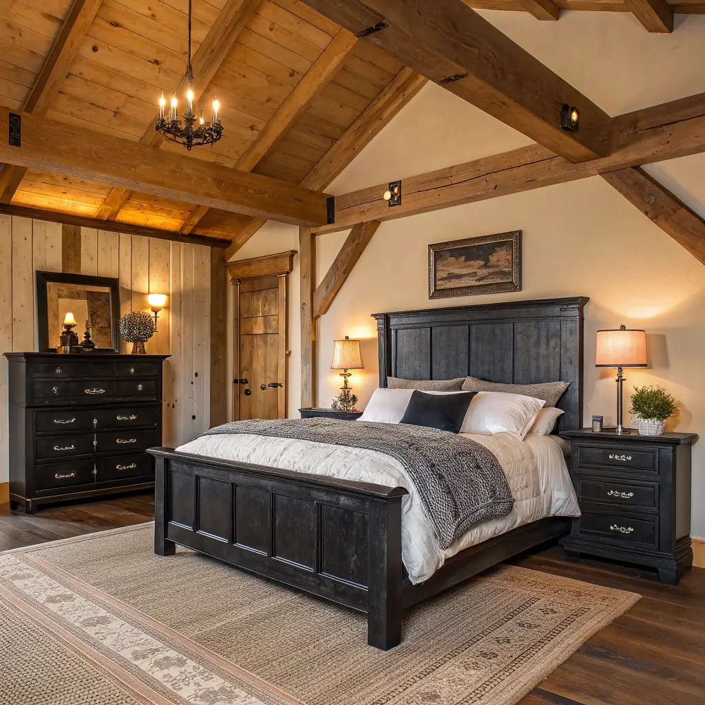 Black furniture in a rustic bedroom? Absolutely! This unexpected combination creates modern farmhouse vibes that feel both contemporary and timeless. The contrast between rough textures and sleek black surfaces adds incredible visual interest.