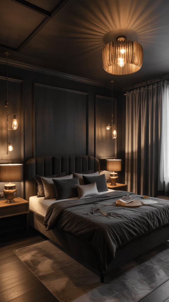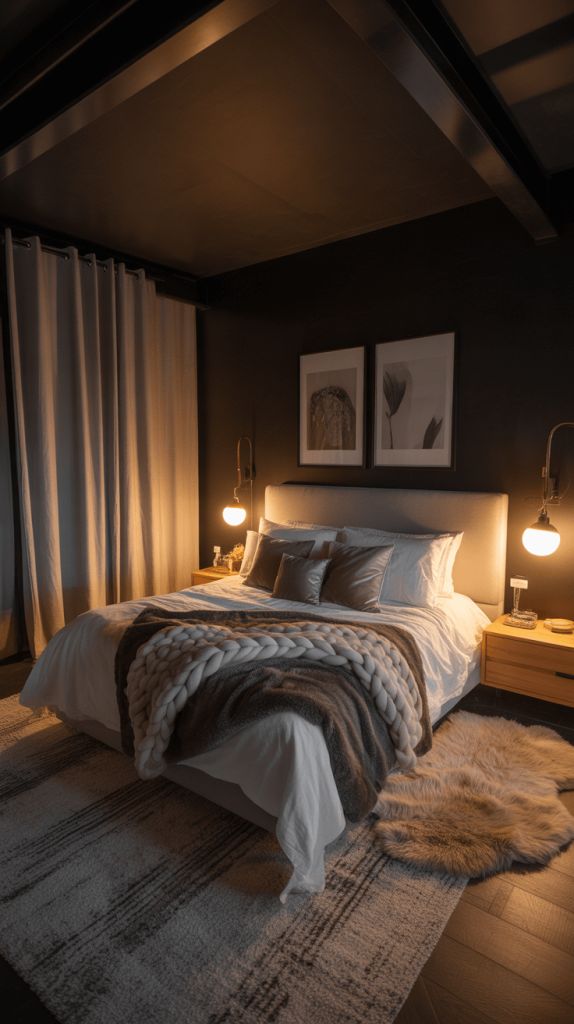 - Warm Woods are Essential: Incorporate natural wood elements on your nightstands, bed frame, or flooring. The warmth of the wood balances the coolness of the black and keeps the space from feeling sterile.