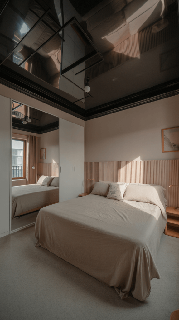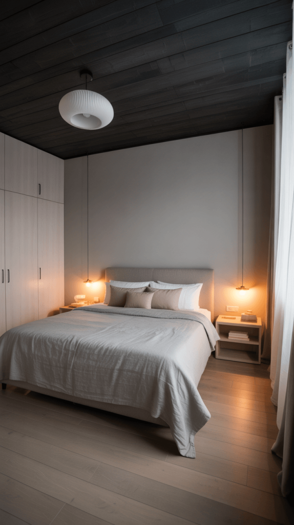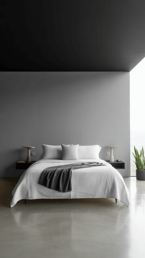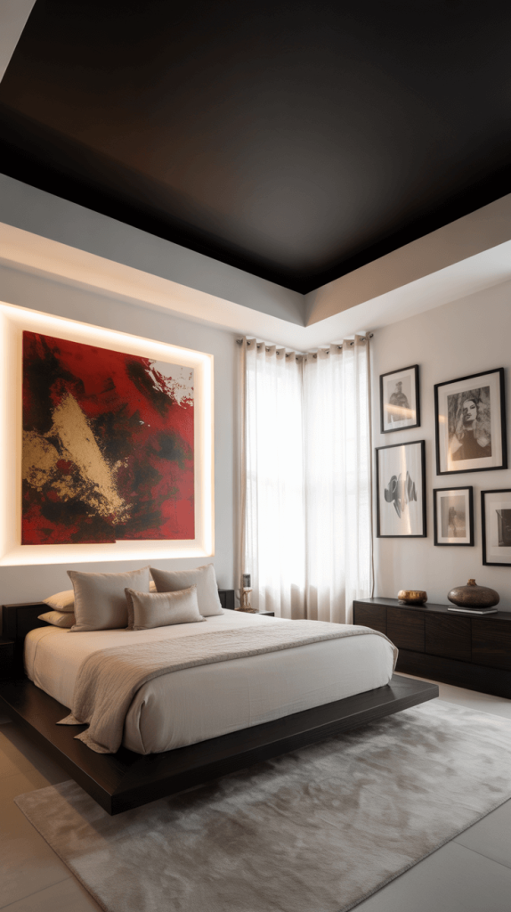 - Focus on Form: Your furniture should be sleek and sculptural. Think platform beds, floating nightstands, and simple, functional pieces. The black ceiling will highlight their shapes beautifully.