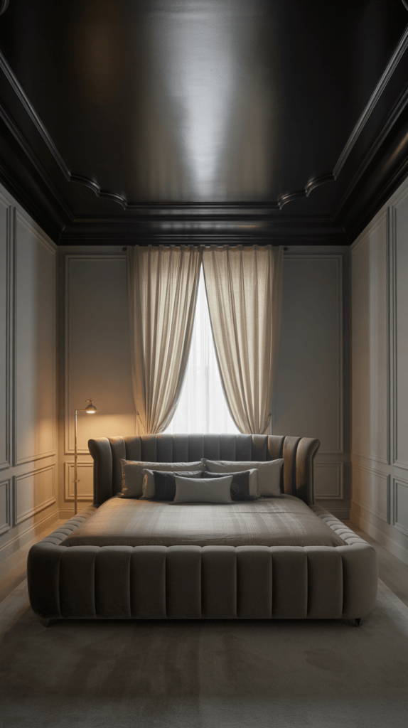 This is about elevating your main bedroom to a five-star hotel suite level. It’s sophisticated, serene, and luxurious. The black ceiling here acts as a foundation of elegance.