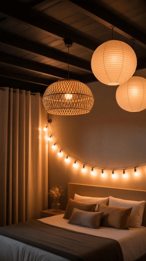 - Think About Fixture Style: Paper lanterns, woven rattan pendants, or fixtures with exposed warm-toned Edison bulbs will diffuse light in a soft, gentle way that complements the ceiling perfectly.