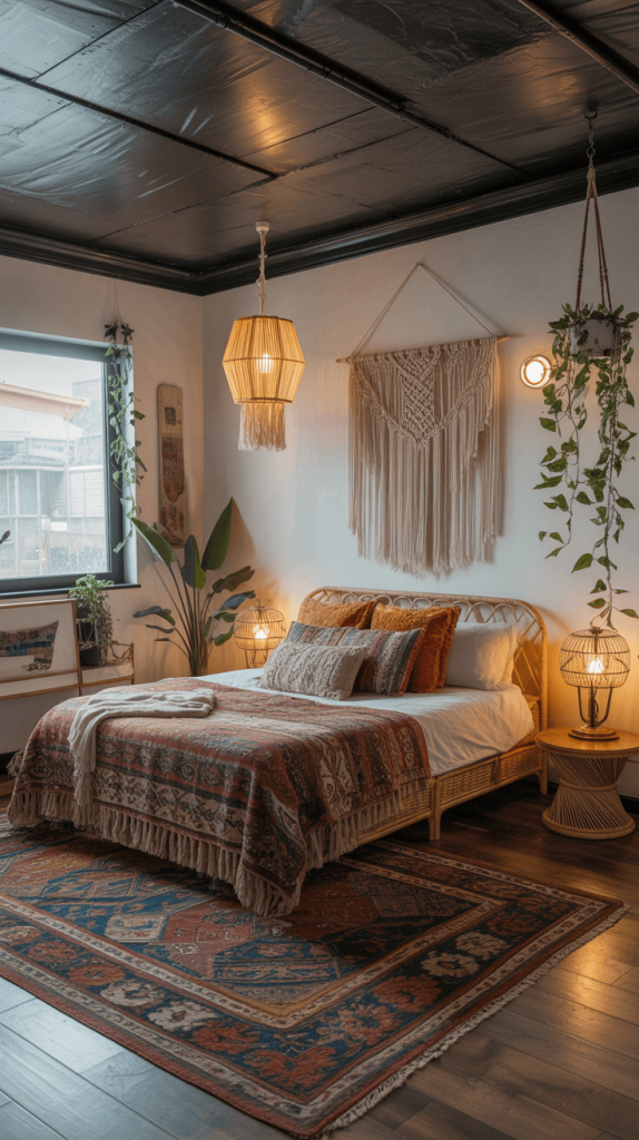 - Pile on the Textiles: Macramé wall hangings, patterned kilim rugs, embroidered pillows, and fringe—lots of fringe. The black ceiling makes all these patterns feel intentional instead of chaotic.